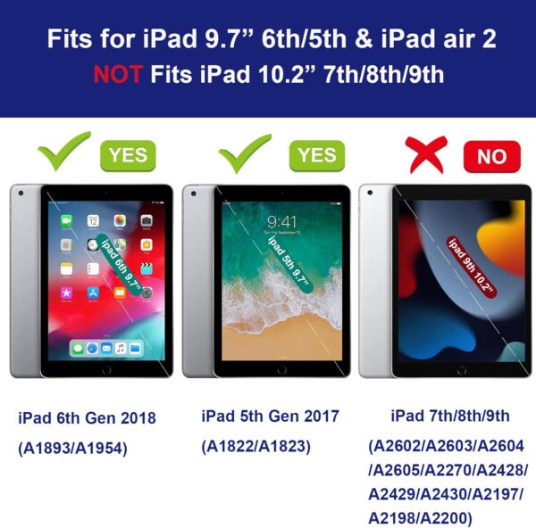 - Compatibility: Designed for iPad 9.7 inch 6th generation (2018 Release), iPad 5th generation (2017 Release), ipad Air 2 (2014 Release). Model number: A1893/A1954/A1822/A1823/A1566/A1567. Please check back bottom of your iPad case to find the model number.